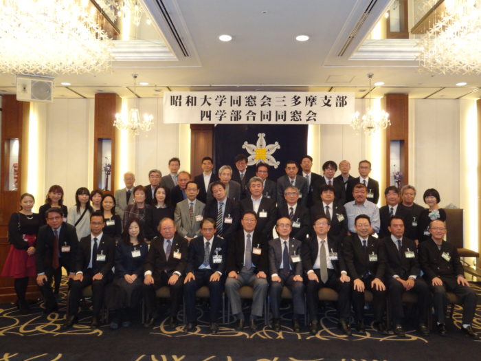 令和元年11月16日(土曜日)18:00~立川グランドホテル 4階スカーラ宴会場にて昭和大学多摩地区四学部合同同窓会が開催されました。歯学部は多摩支部・武蔵野支部合同で参加させて頂きました。医学部同窓会多摩地区支部長の小野卓哉先生から合同同窓会開催のお知らせを頂き会員の先生方にFAXでお知らせしましたが、急な日程にもかかわらず多くの先生方に御出席頂きありがとうございました。
